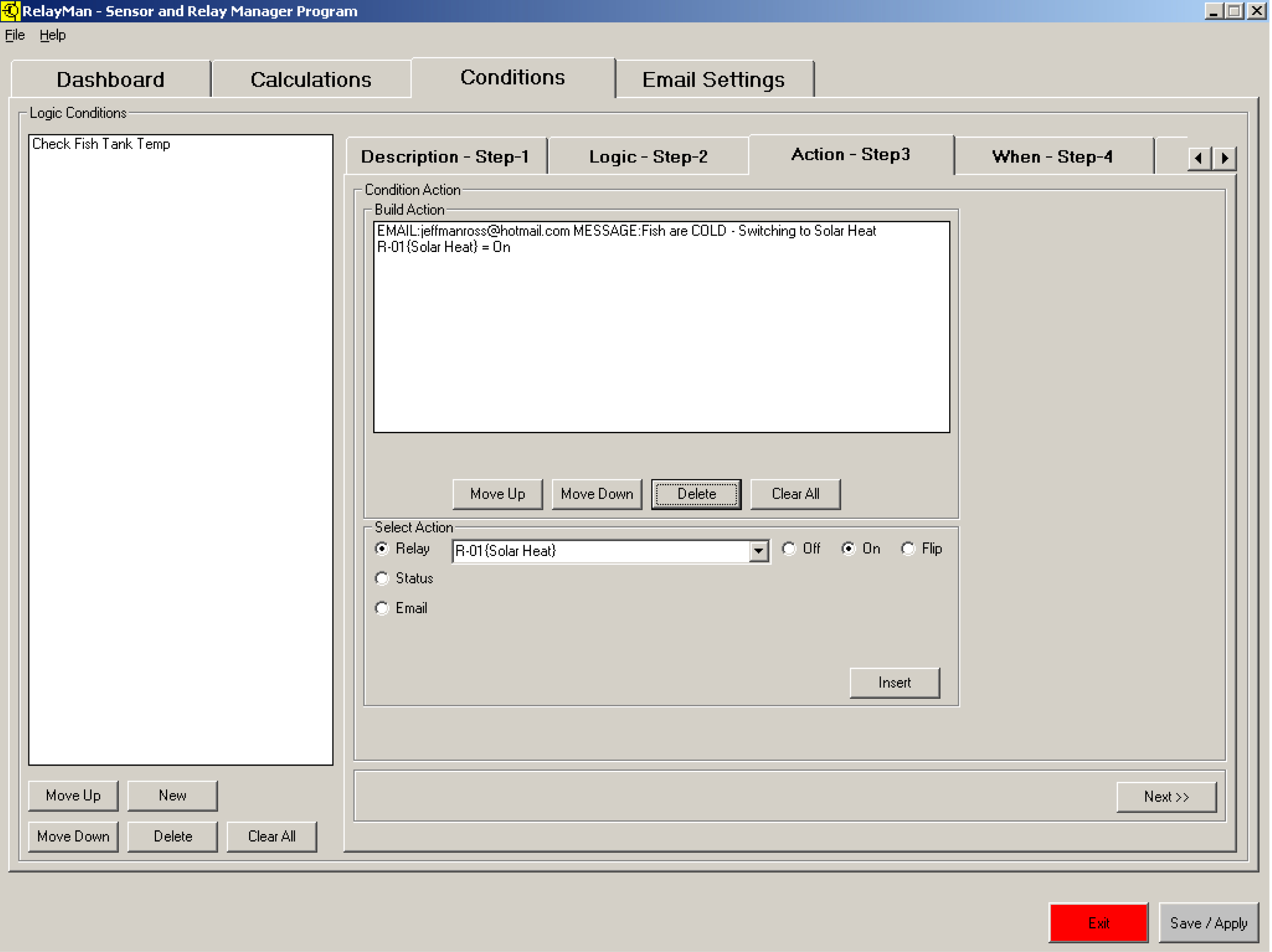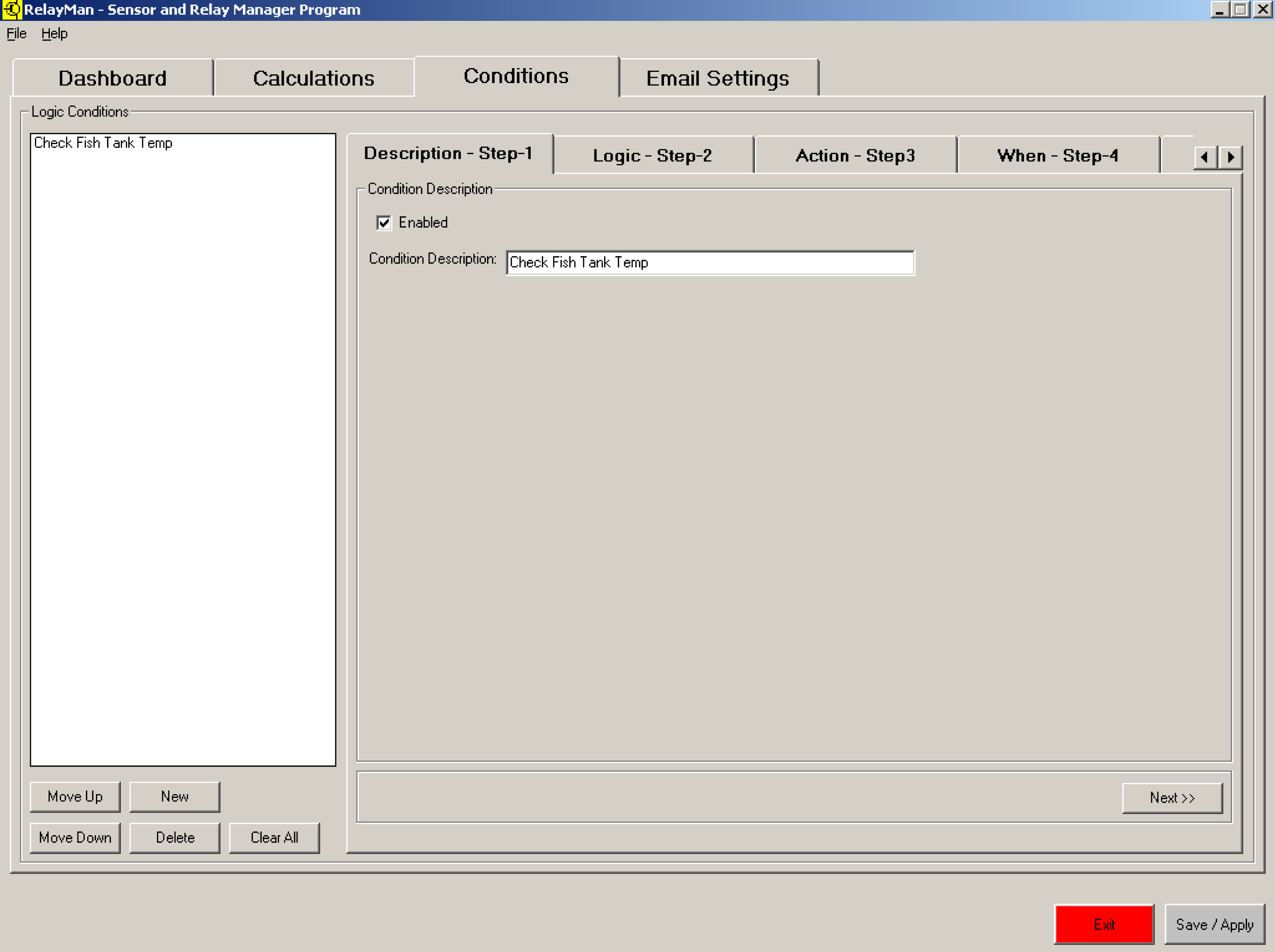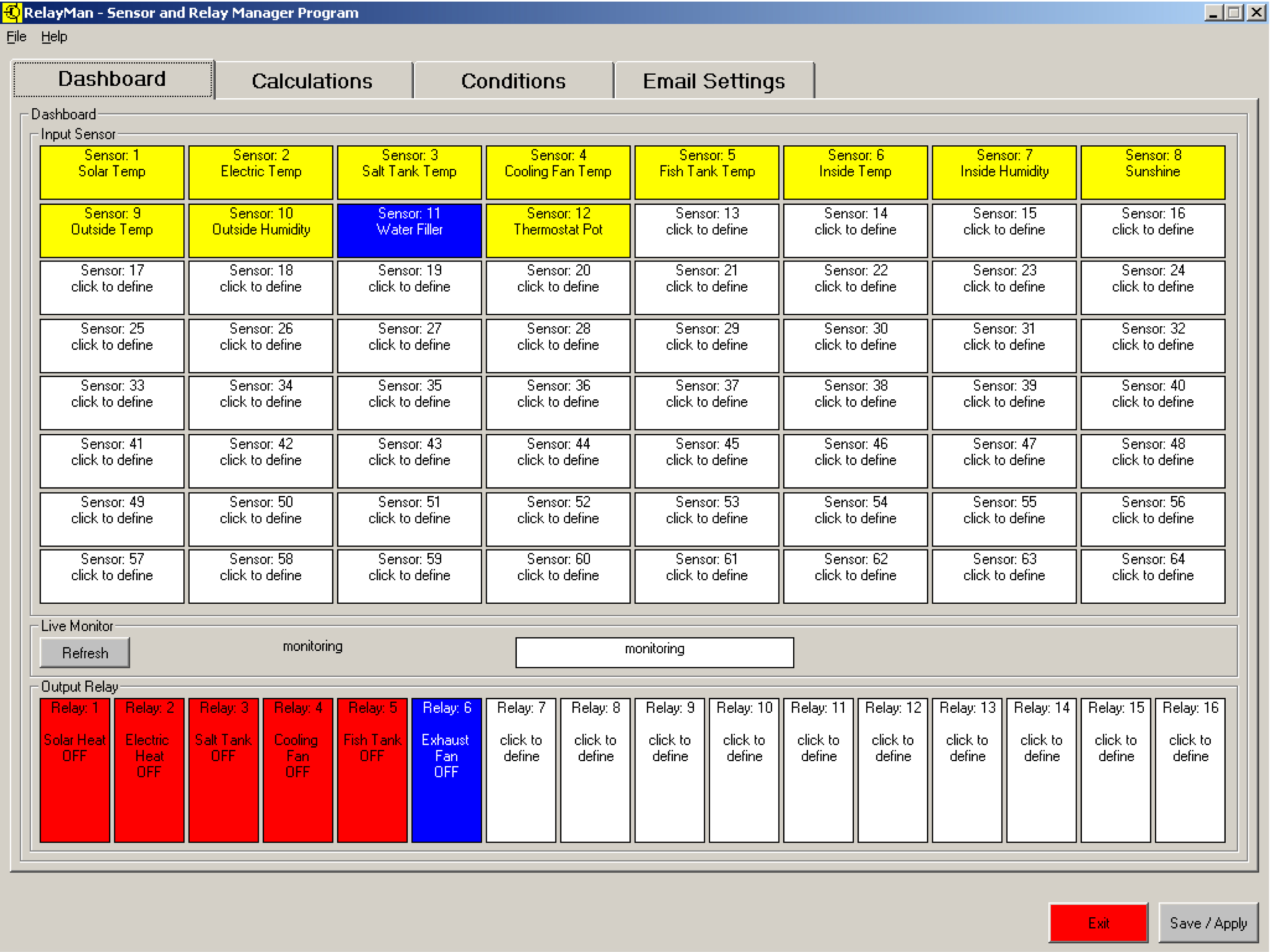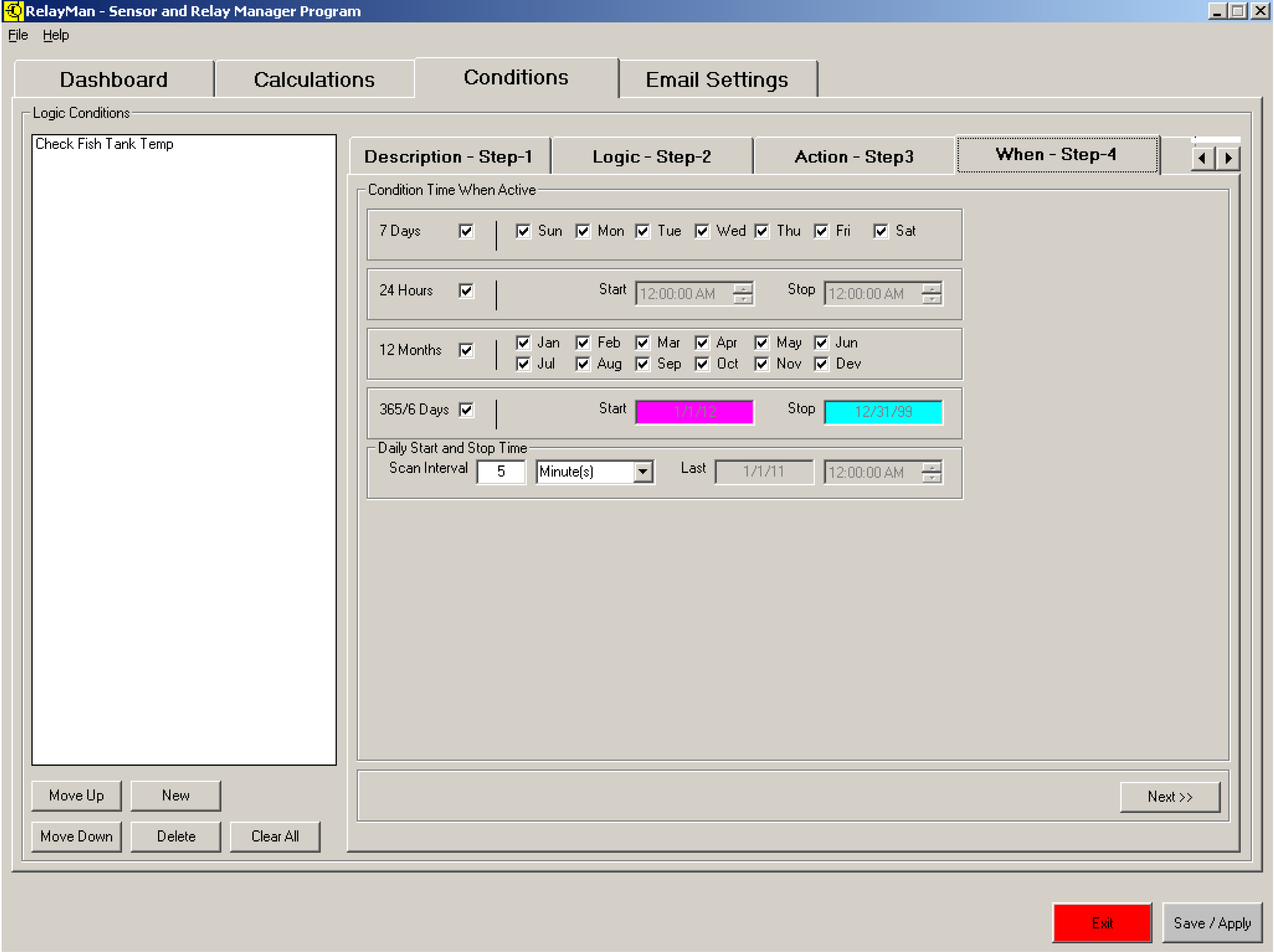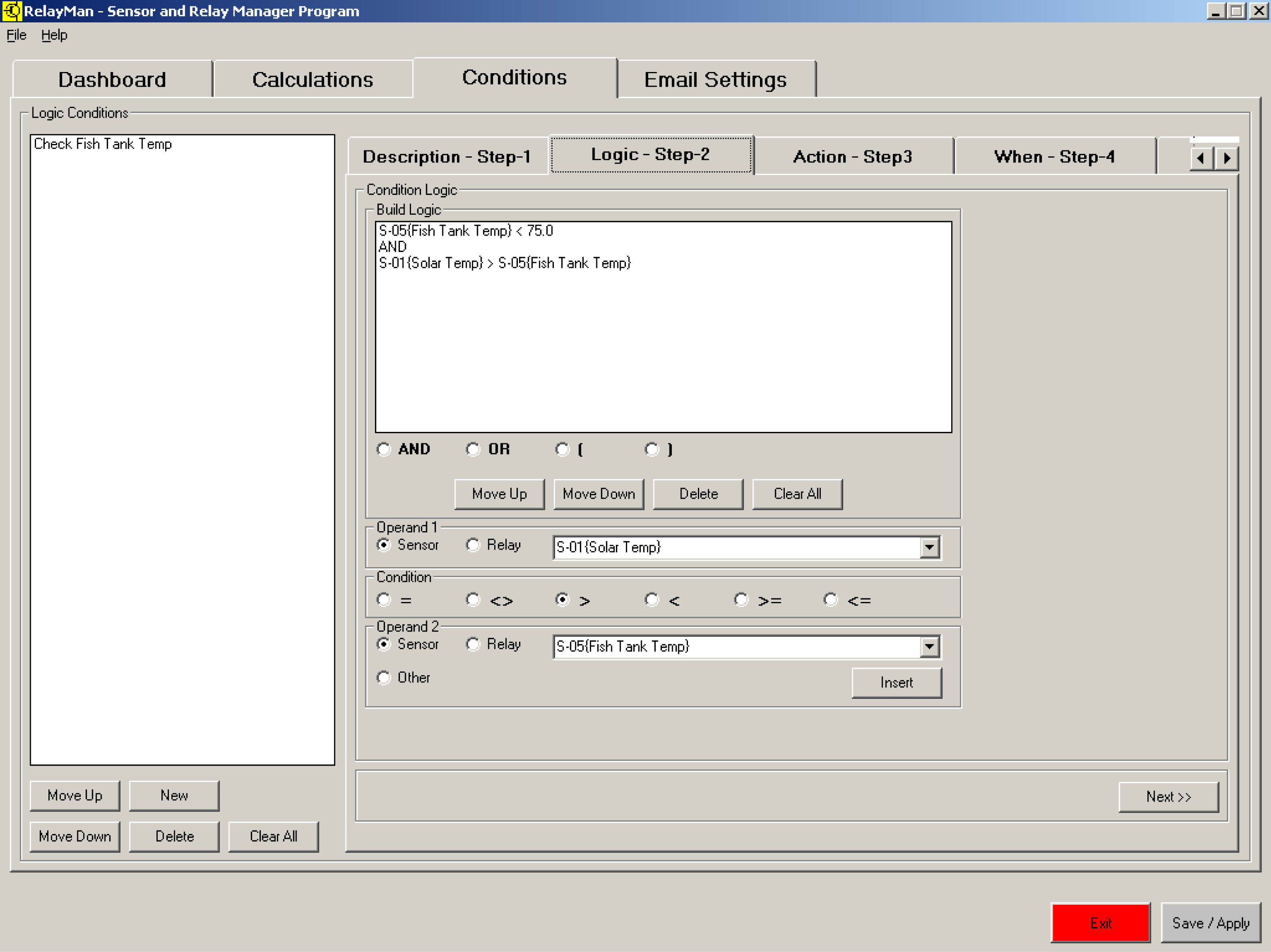 v2.2.0 - Sensor Dashboard - Displayed the values of the 64 sensors (undefined are white) inputs and status of 16 relaysv2.2.0 - Logic Definition Screen1 - Assign name to logicv2.2.0 - Logic Definition Screen2 - Create logic values to be evaluated (now has pull downs with descriptions)v2.2.0 - Logic Definition Screen3 - Create actions (now has pull downs with descriptions)v2.0 - Logic Definition Screen4 - Schedule (easier to use pick dates from calendars)v2.2.0 - System Setup Screen - Define email address and communication parameters (new firmware versions)