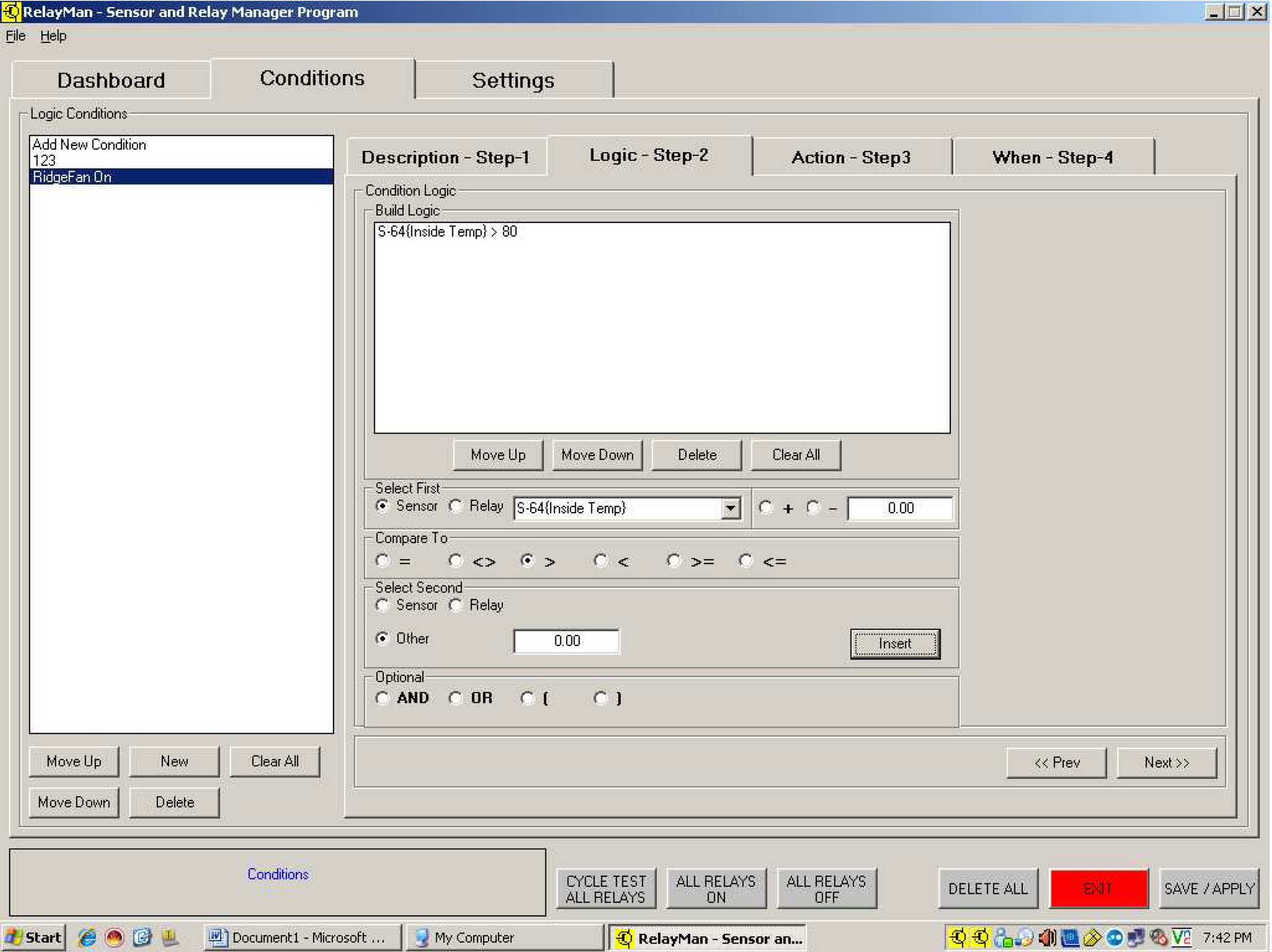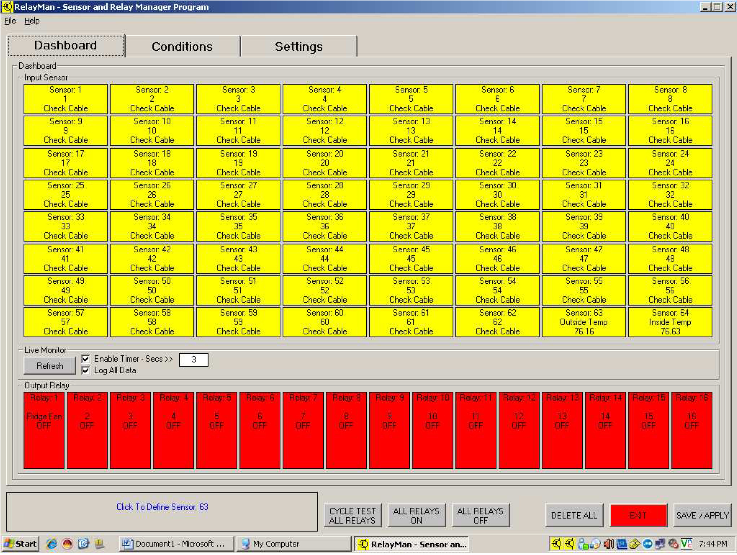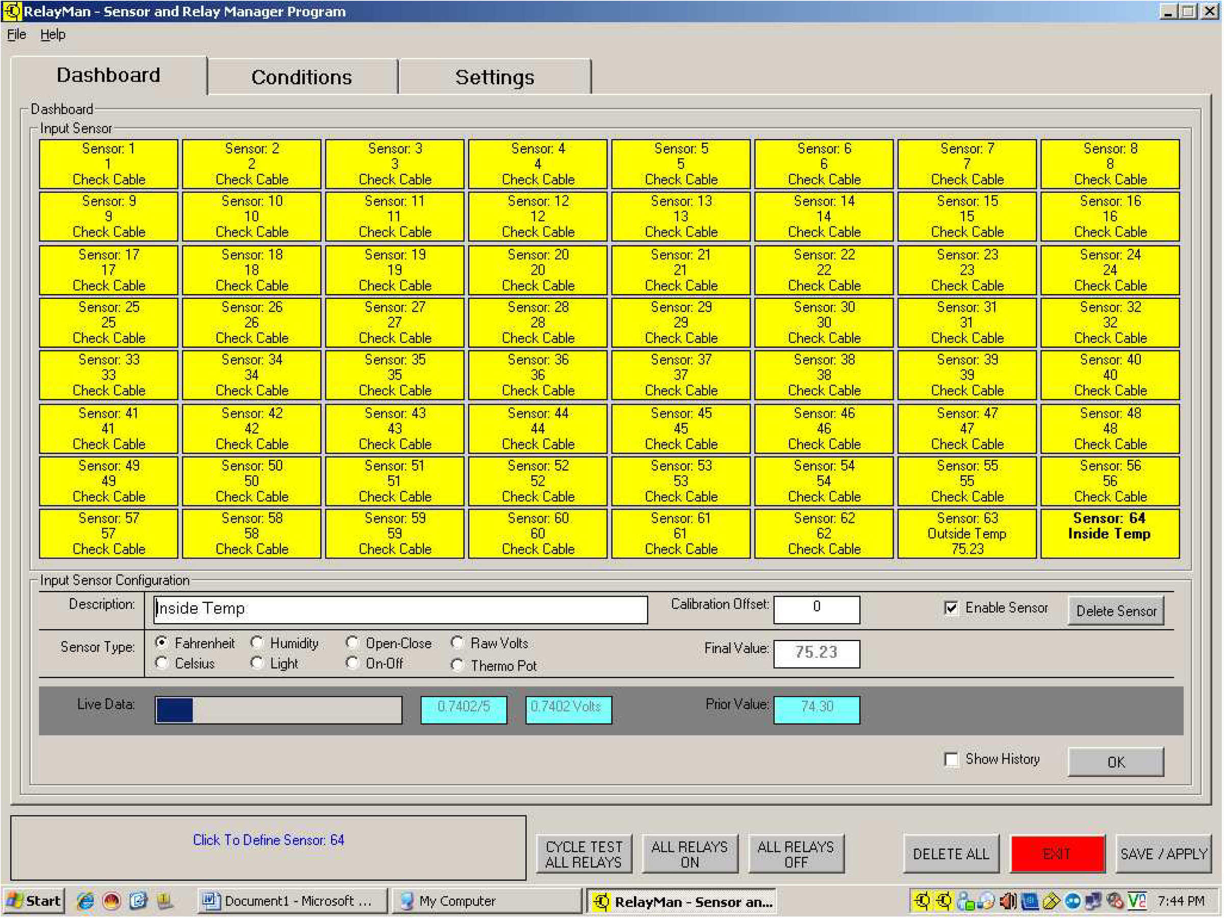 v2.0 - Sensor Dashboard - Displayed the values of the 64 sensors inputs and status of 16 relaysv2.0 - Sensor Definition - Select sensor types (4 new sensors)v2.0 - Relay Definition - Assign names to relays, test relays live (data logging now available)v2.0 - Logic Definition Screen1 - Assign name to logicv2.0 - Logic Definition Screen2 - Create logic values to be evaluated (now allows multiple conditions)v2.0 - Logic Definition Screen3 - Create actions (now allows for multiple actions for true condition)v2.0 - Logic Definition Screen4 - Schedule (now 24/7/12/365 scheduling)v2.0 - System Setup Screen - Define email address and communication parameters