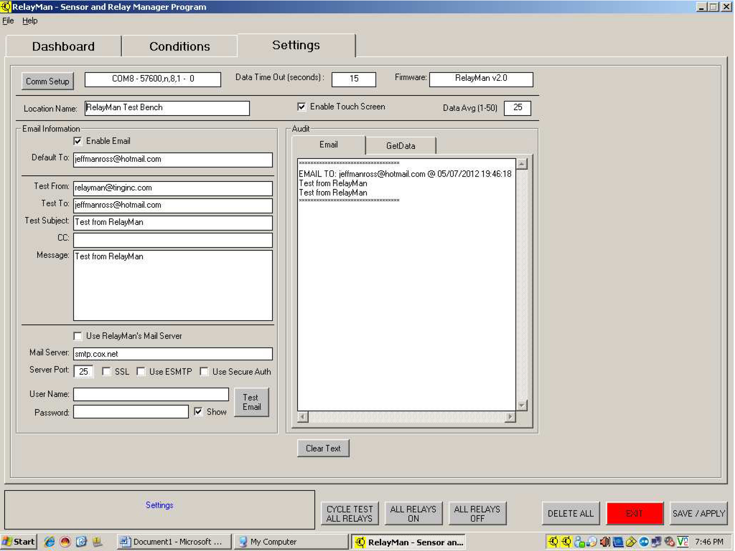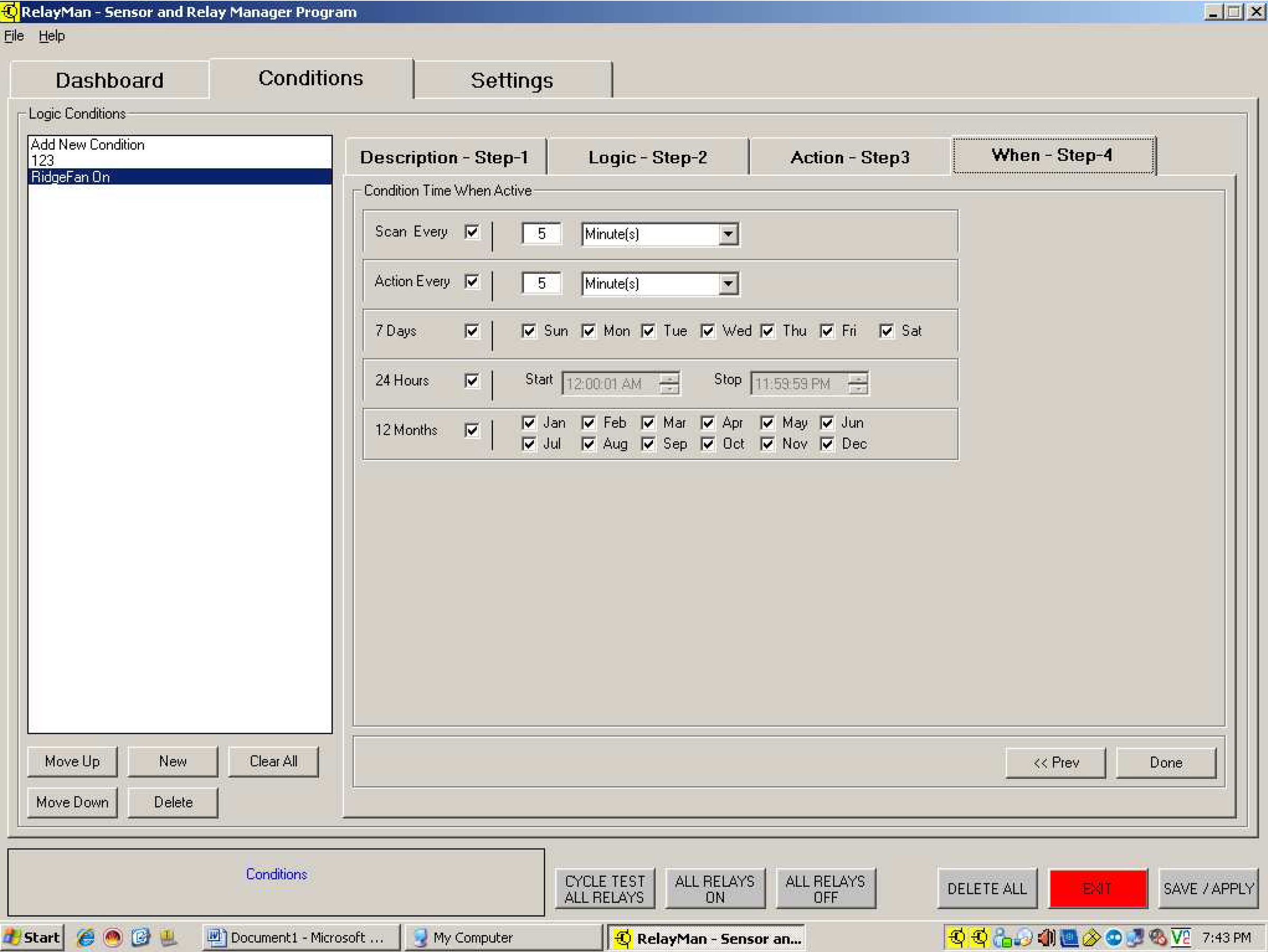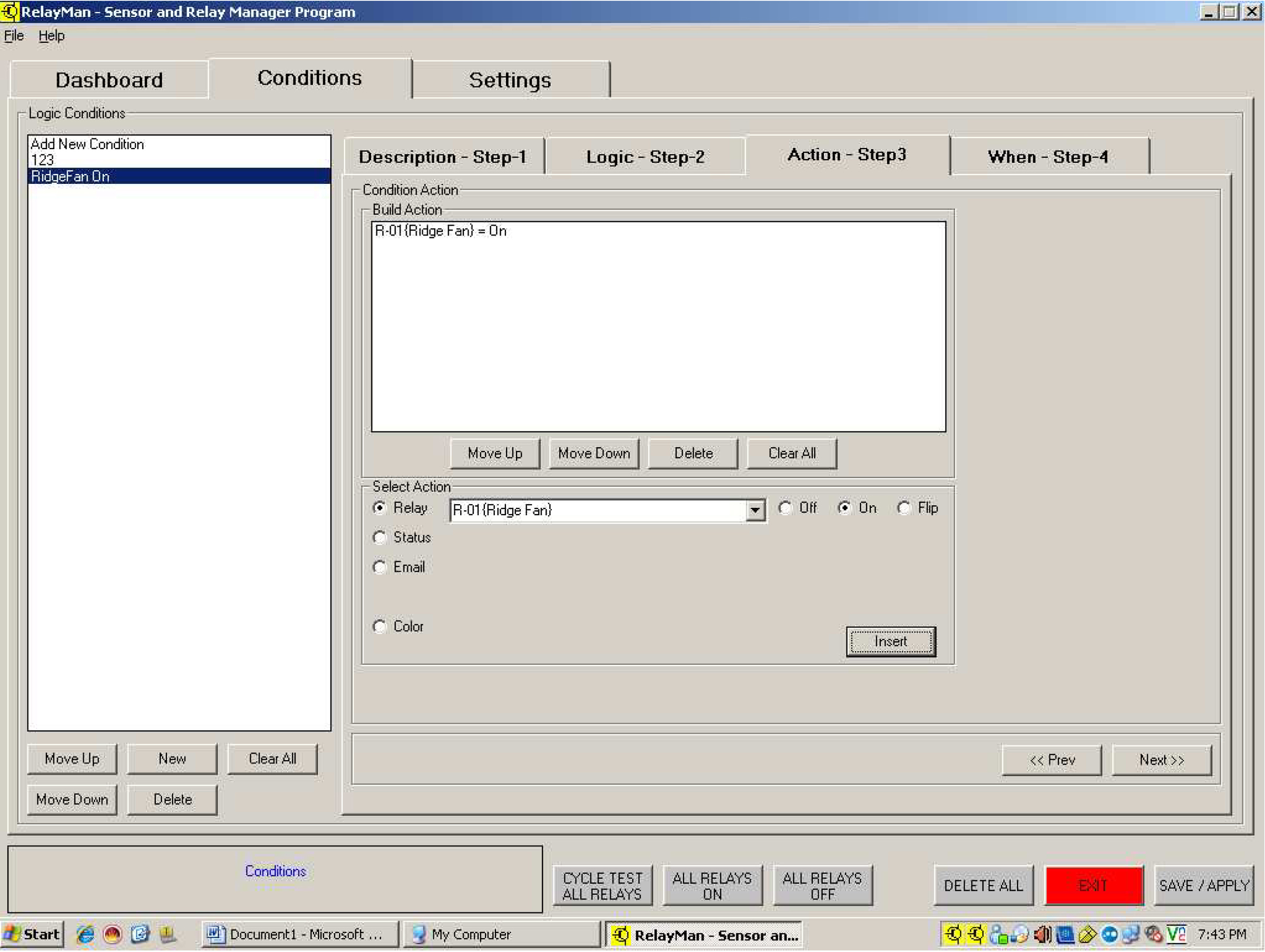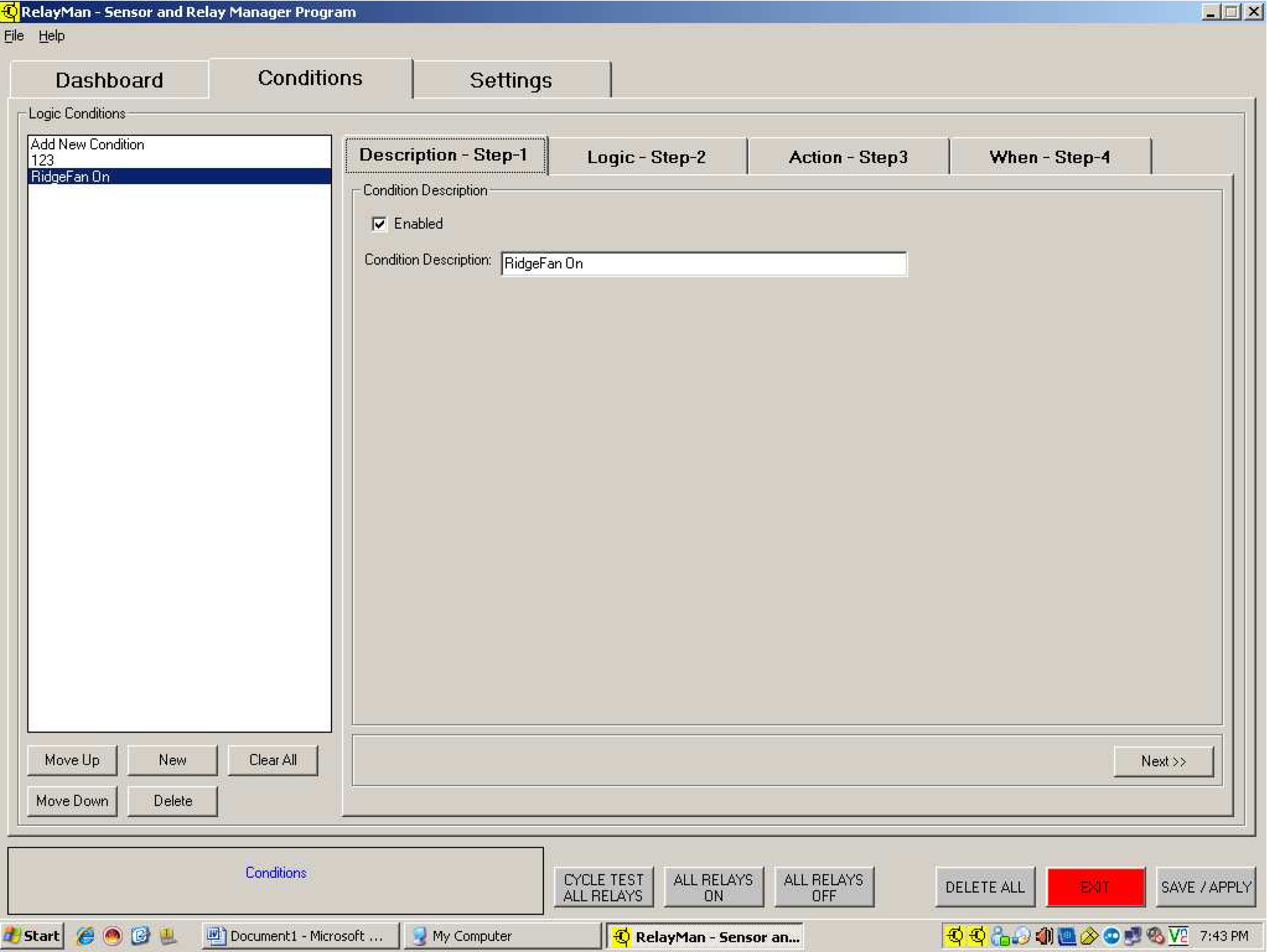 v2.0 - Sensor Dashboard - Displayed the values of the 64 sensors inputs and status of 16 relaysv2.0 - Sensor Definition - Select sensor types (4 new sensors)v2.0 - Relay Definition - Assign names to relays, test relays live (data logging now available)v2.0 - Logic Definition Screen1 - Assign name to logicv2.0 - Logic Definition Screen2 - Create logic values to be evaluated (now allows multiple conditions)v2.0 - Logic Definition Screen3 - Create actions (now allows for multiple actions for true condition)v2.0 - Logic Definition Screen4 - Schedule (now 24/7/12/365 scheduling)v2.0 - System Setup Screen - Define email address and communication parameters