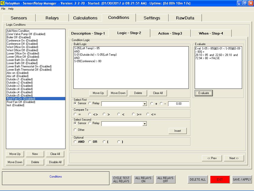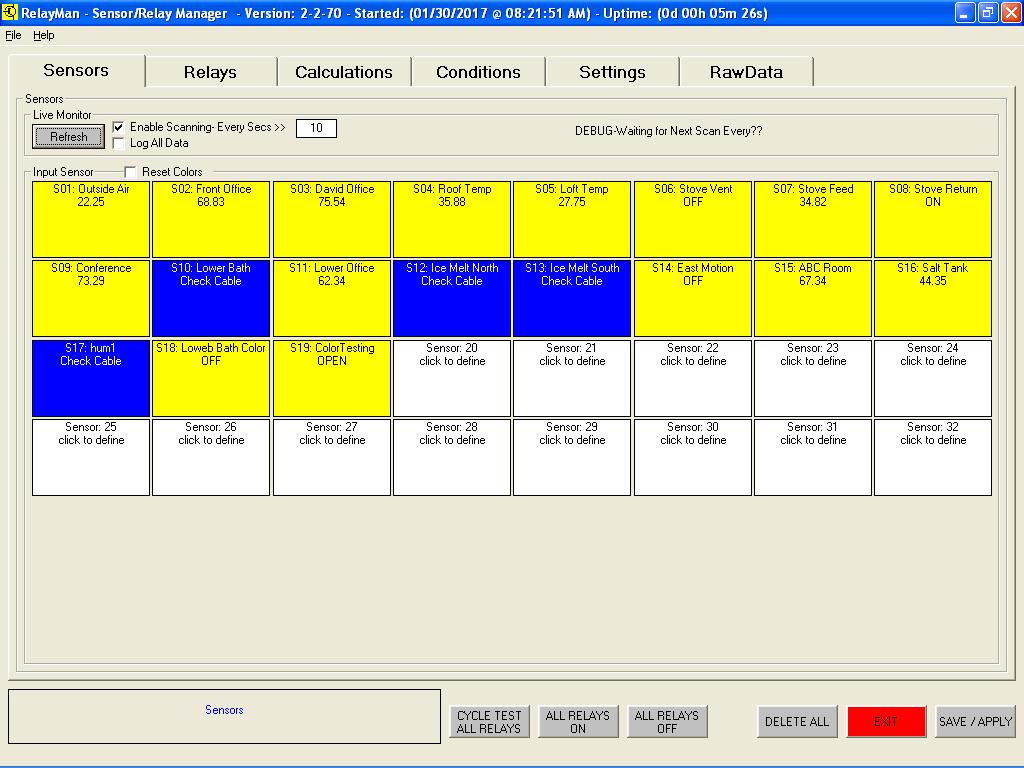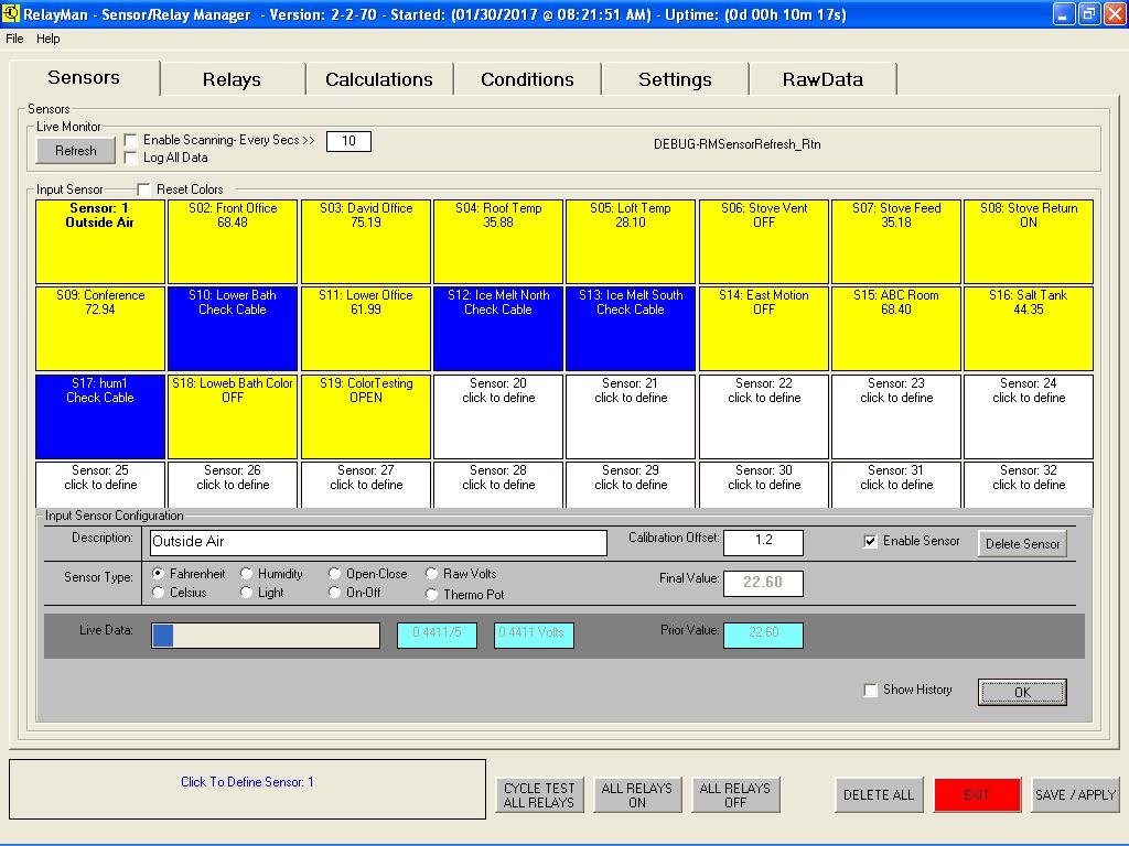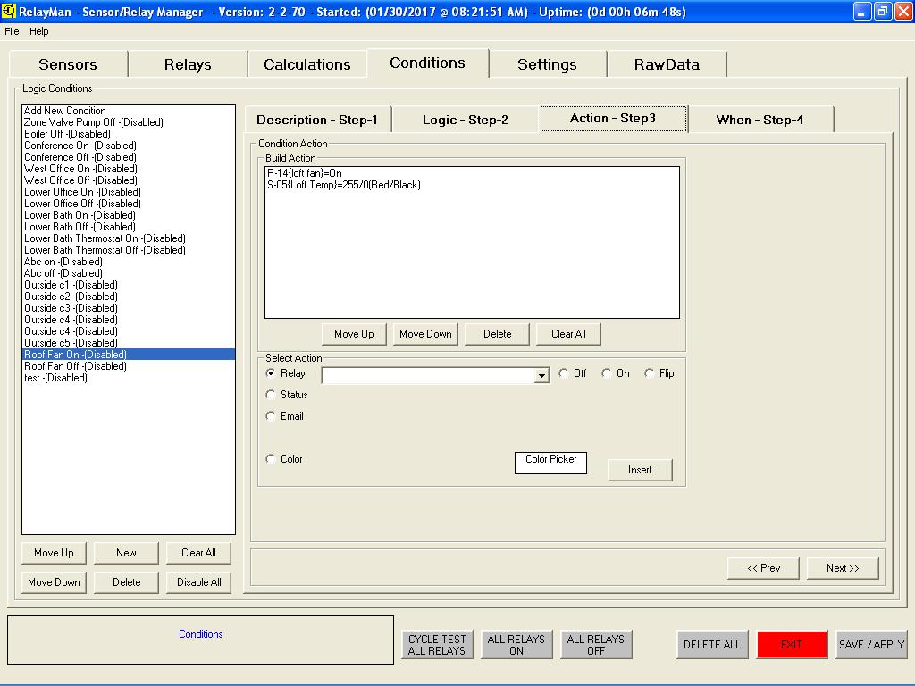 v2.2.7 - Sensor Dashboard - Displayed the values of the sensors (undefined are white and count is based on modules installed)v2.2.7 - Sensor Definition - Select sensor types (new see data graph live, allow for calibration offsets)v2.2.7 - Relay Dashboard - Displayed the values of the relays (live monitor added with interval scanning)v2.2.7 - Relay Definition - Assign names to relays, test relays livev2.2.7 - Logic Definition Screen1 - Assign name to logicv2.2.7 - Logic Definition Screen2 - Create logic values to be evaluated (now has live evaluate window)v2.2.7 - Logic Definition Screen2 - Evaluate Button Pushedv2.2.7 - Logic Definition Screen3 - Actions (new ability to change button colors on actions)v2.2.7 - Logic Definition Screen4 - Schedule (improved scheduling date and time picking)v2.2.7 - System Setup Screen - (new default button colors, data smoothing/averaging )v2.2.7 - System Setup Screen - (new save and load different configurations)v2.2.7 - System Setup Screen - (new free 30-day demo license to tryit before you buy it)
