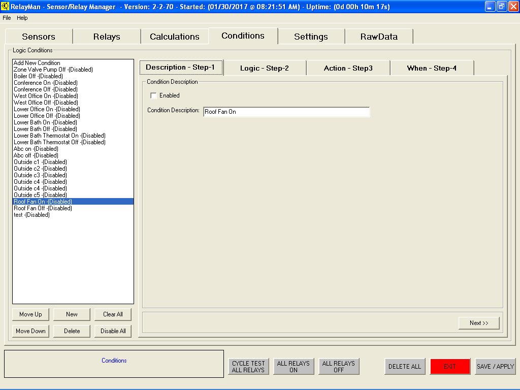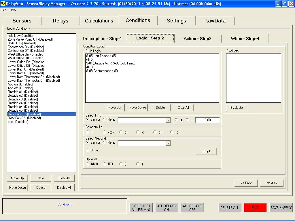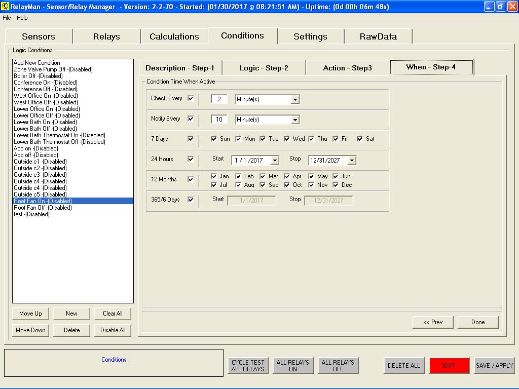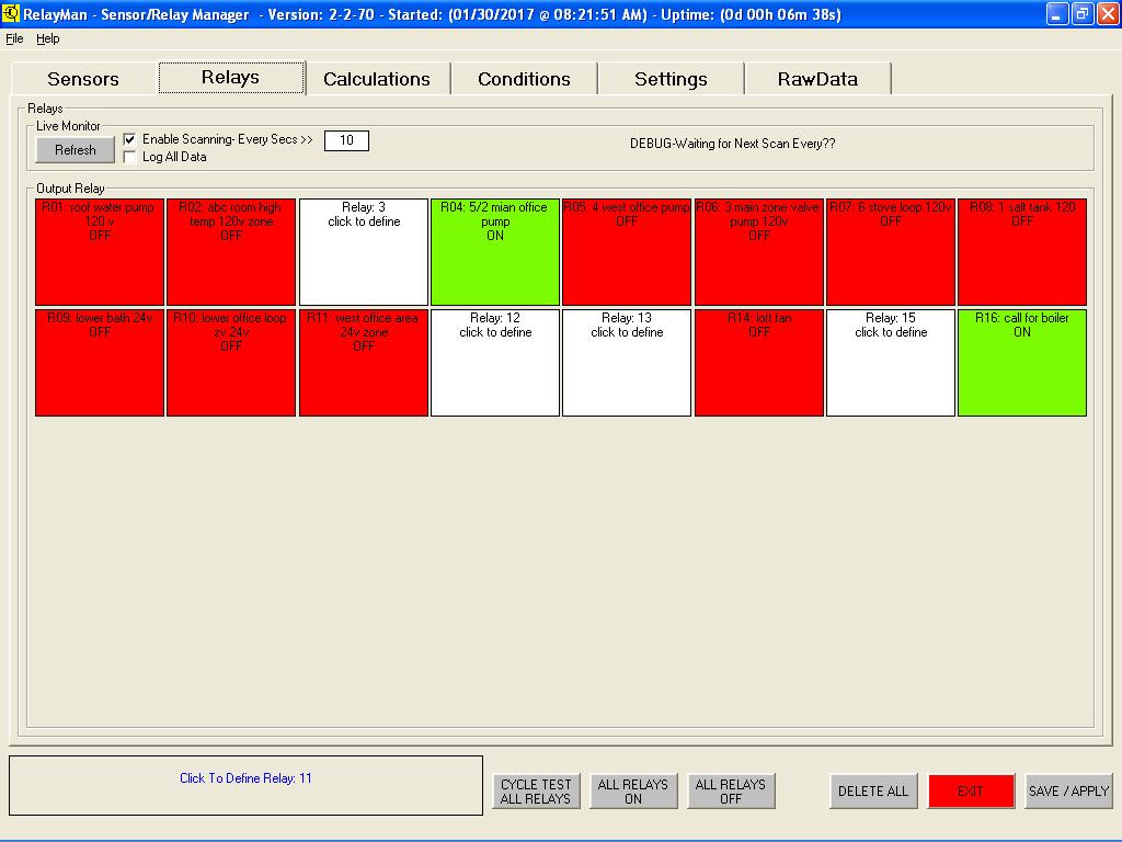 v2.2.7 - Sensor Dashboard - Displayed the values of the sensors (undefined are white and count is based on modules installed)v2.2.7 - Sensor Definition - Select sensor types (new see data graph live, allow for calibration offsets)v2.2.7 - Relay Dashboard - Displayed the values of the relays (live monitor added with interval scanning)v2.2.7 - Relay Definition - Assign names to relays, test relays livev2.2.7 - Logic Definition Screen1 - Assign name to logicv2.2.7 - Logic Definition Screen2 - Create logic values to be evaluated (now has live evaluate window)v2.2.7 - Logic Definition Screen2 - Evaluate Button Pushedv2.2.7 - Logic Definition Screen3 - Actions (new ability to change button colors on actions)v2.2.7 - Logic Definition Screen4 - Schedule (improved scheduling date and time picking)v2.2.7 - System Setup Screen - (new default button colors, data smoothing/averaging )v2.2.7 - System Setup Screen - (new save and load different configurations)v2.2.7 - System Setup Screen - (new free 30-day demo license to tryit before you buy it)
